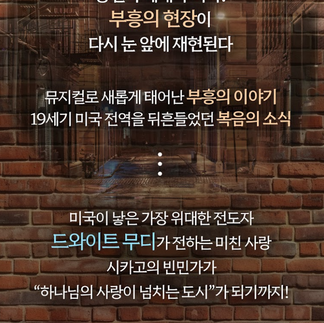 지난 1907 집회때 ‘평양대부흥 뮤지컬‘을 공연했던 <하나무브먼트> 에서 이번에는 드와이트 D. L. 무디를 주인공으로 하는 ’시카고의 아이들‘이라는 제목으로 뮤지컬 공연을 한다고 해요. 그동안 ’부흥‘을 주제로 오순절 성령강림과 평양 대부흥에 대한 뮤지컬을 제작해왔는데, 이번에는 19세기에 미국 전역을 흔들었던 대부흥을 소재로 공연하게 되었다고 합니다.